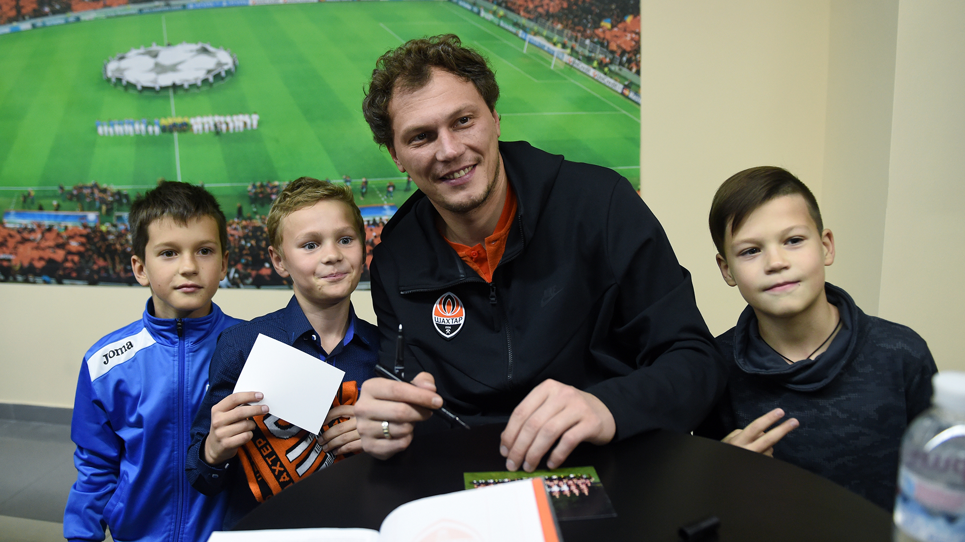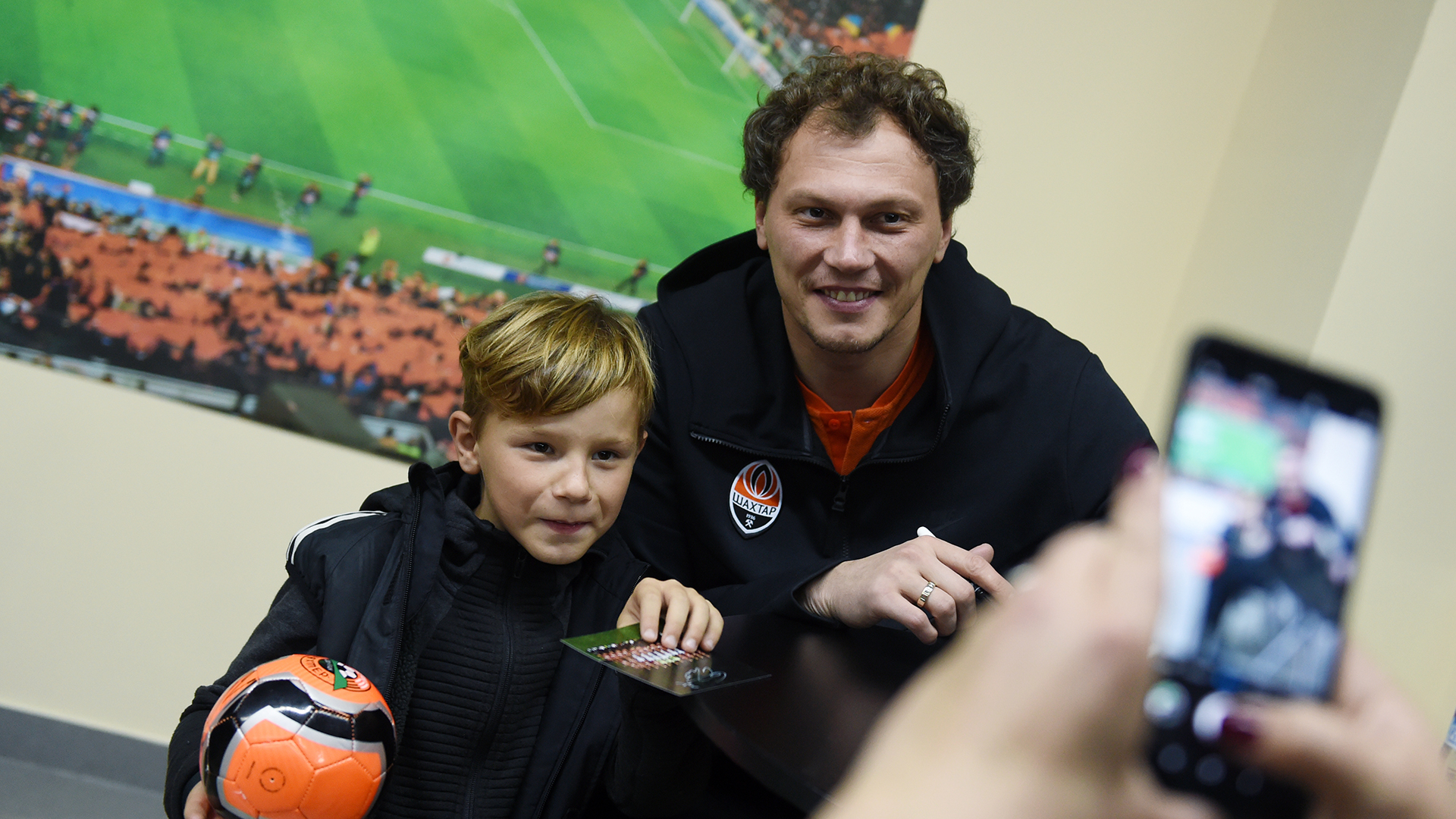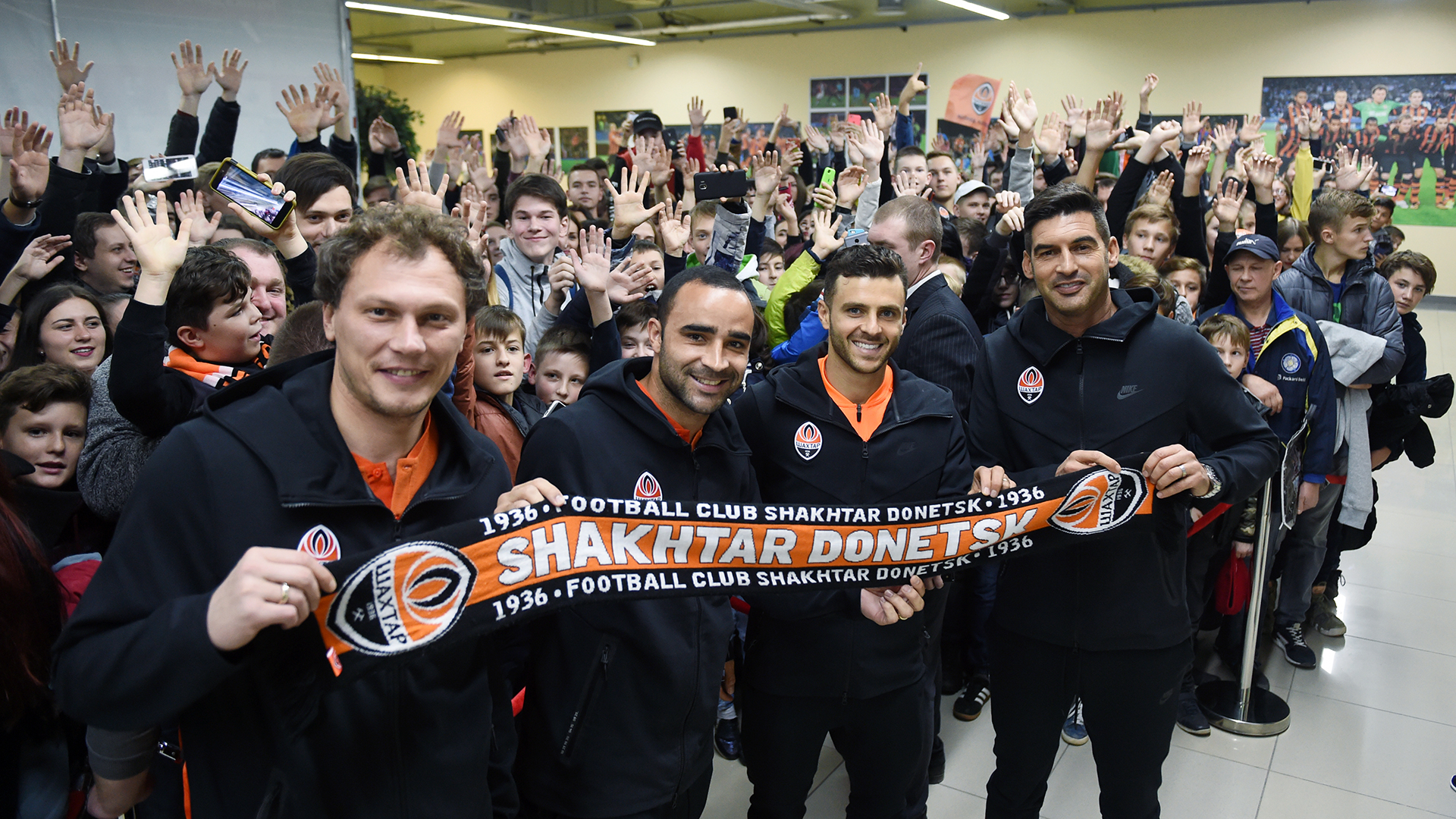 В открытии выставки и фотосессии с болельщиками приняли участие наставник "Шахтера" Паулу Фонсека, вратарь Андрей Пятов, защитник Исмаили и нападающий Жуниор Мораес.