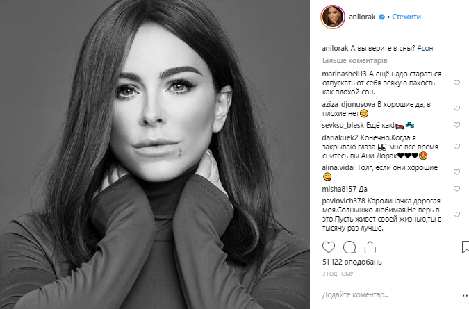 Активно гастролирующая в России и от этого впавшая в немилость в Украине певица Ани Лорак показала в соцсети новый образ. На странице в Instagram она опубликовала черно-белое фото. "А вы верите в сны?", - подписала Ани Лорак свой снимок.