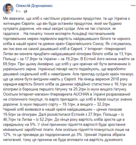"В нашей стране уже не самый дешевый хлеб в Европе. В Литве можно приобрести самый дешевый килограмм белого хлеба за 13,1 грн, Польше - по 17,8 грн и Украине - по 19,2 грн. В Эстонии его можно найти по 69,5 грн. При этом вероятно, что хлеб в этих странах мог быть испеченным с украинского зерна. Украинские хлебопеки часто говорят, что производить дешевый социальный хлеб невыгодно. Но пример соседних стран показывает, что это может быть выгодно даже в Европе", – отметил Дорошенко.