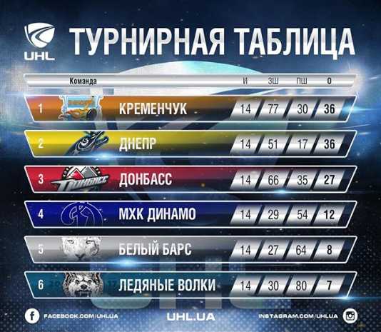 На данный момент турнирная таблица третьего сезона Украинской хоккейной лиги выглядит таким образом: