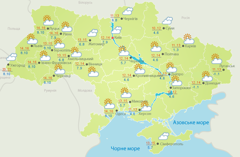 • На севере Украины без осадков. Температура воздуха ночью +4…+8 градусов, днем +10…+13 градусов.