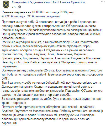 На Донбассе в районе операции Объединенных сил 3 ноября были ранены двое украинских военных, еще один получил ранения в воскресенье. Сепаратисты дважды стреляли из запрещенного "Минском" оружия. Об этом сообщает пресс-центр штаба (ООС) в Facebook.