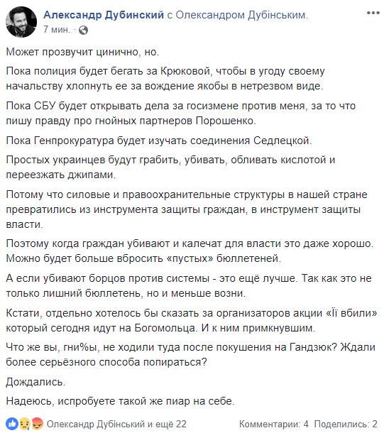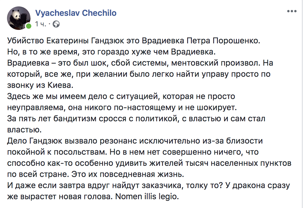 "Убийство Екатерины Гандзюк – это Врадиевка Петра Порошенко. Но, в то же время, это гораздо хуже, чем Врадиевка. Врадиевка – это был шок, сбой системы, ментовский произвол. На который, все же, при желании было легко найти управу просто по звонку из Киева. Здесь же мы имеем дело с ситуацией, которая не просто неуправляема, она никого по-настоящему и не шокирует. За пять лет бандитизм сросся с политикой, с властью и сам стал властью. Дело Гандзюк вызвало резонанс исключительно из-за близости покойной к посольствам. Но в нем нет совершенно ничего, что способно как-то особенно удивить жителей тысяч населенных пунктов по всей стране. Это их повседневная жизнь. И даже если завтра вдруг найдут заказчика – толку-то? У дракона сразу же вырастет новая голова. Nomen illis legio", – пишет журналист Вячеслав Чечило.