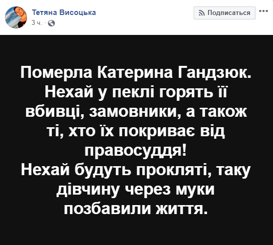 "Умерла Катерина Гандзюк. Пусть в пекле горят ее убийцы и заказчики, а также те, кто их покрывает от правосудия! Пусть будут прокляты, такую девушку с муками лишили жизни", – пишет журналист Татьяна Высоцкая.