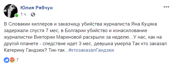 "В Словакии киллеров и заказчицу убийства журналиста Яна Куцяка задержали спустя 7 мес., в Болгарии убийство и изнасилование журналистки Виктории Мариновой раскрыли за неделю...У нас, как на другой планете, – следствие идет 3 мес., девушка умерла. Так кто заказал Катерину Гандзюк? Тик-так", – пишет журналист Юлия Рябчун.