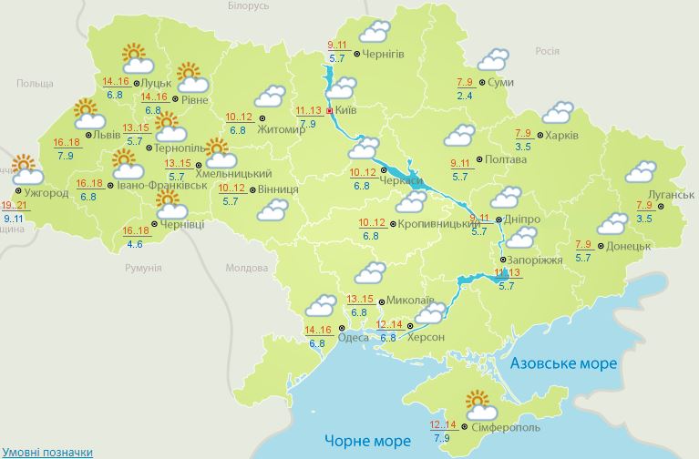 Температура в западных областях и на крайнем юге ночью 2-7° тепла, днем 10-15°, в Закарпатье до 18°; на остальной территории ночью 0-5° тепла, днем 6-11°.
