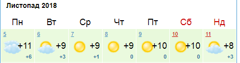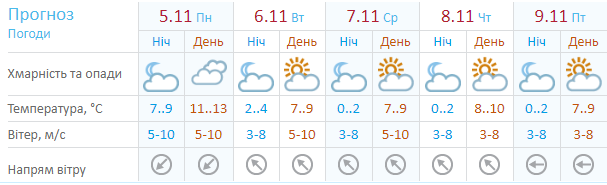 По данным Укргидрометцентра, в понедельник, 5 ноября, в Киеве пасмурно, днем +11...+13. Со вторника синоптики обещают переменную облачность, температура немного снизится до +7...+10 днем, со среды ночью термометры опустятся до 0...+2.