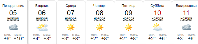Сайт Weather.com обещает, что днем термометры покажут +9...+10, в понедельник пасмурно - далее переменная облачность и солнечная погода. На выходных +7...+8, переменная облачность, без осадков.