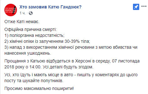 Но в сообществе "Хто замовив Катю Гандзюк" сообщается, что официальная причина смерти:  "полиорганная недостаточность, химические ожоги 30-39% процентов тела, нападение с использованием химического вещества с целью убийства или нанесения повреждений".