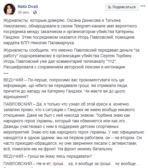 ПАВЛОВСКИЙ: – Да, я только что узнал об этой ереси и, конечно, заявляю прямо, что к ситуации с Гандзюк не имею вообще никакого отношения. Даже не был с ней никогда знаком. Торбина знаю как народного героя Украины, который там обвиняется или как это… Дважды участвовал с ним в поддержке детских спортивных мероприятий. Знаю его как народного героя Украины. У нас официально находятся в одном здании: мы на первом работаем, он – на втором. Он часто приходил-обращался, ну они звернення писали с активистами, всё, помогали им на фронт. На фронт ихнему батальону.