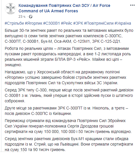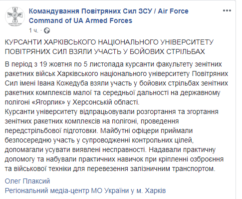 Об этом сообщает командование Воздушных сил ВСУ на своей странице в Facebook.