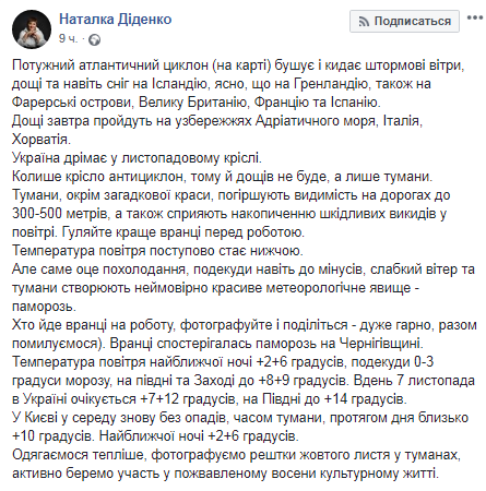 Диденко отмечает, что температура воздуха ближайшей ночью составит +2...+6 градусов, местами 0...-3 градуса.  Днем 7 ноября в Украине ожидается +7...+12 градусов, на юге до +14 градусов. В Киеве в среду без осадков, временами туманы, в течение дня около +10 градусов. Ближайшей ночью +2...+6 градусов.