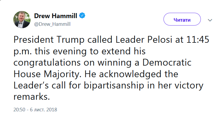"Президент Трамп позвонил лидеру Пелоси в 11:45 (местное время - Прим.Ред.) этим вечером, чтобы поздравить с завоеванием большинства в Палате. Он выразил признательность лидеру за ее призыв к сотрудничеству двух партий в ее заявлении по поводу победы", - написал Хэммилл.