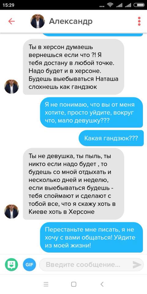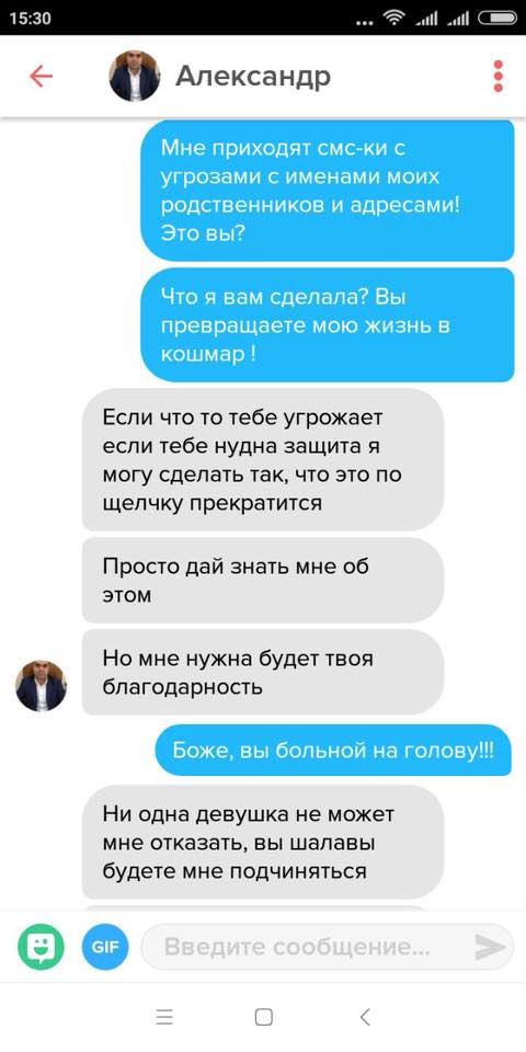 "Александр начал писать оскорбления и угрожать мне расправой, писать, что я его собственность, что я никто, что он может делать со мной все, что достанет меня везде. Всё бы это было похоже на угрозы в интернете от обиженного человека, но они не прекратились. Каким-то образом он узнал обо мне всё. Адреса меня и моих близких, номера телефонов, стал писать смс-ки и требовать контакта, угрожая физической расправой", - делится Бурейко.