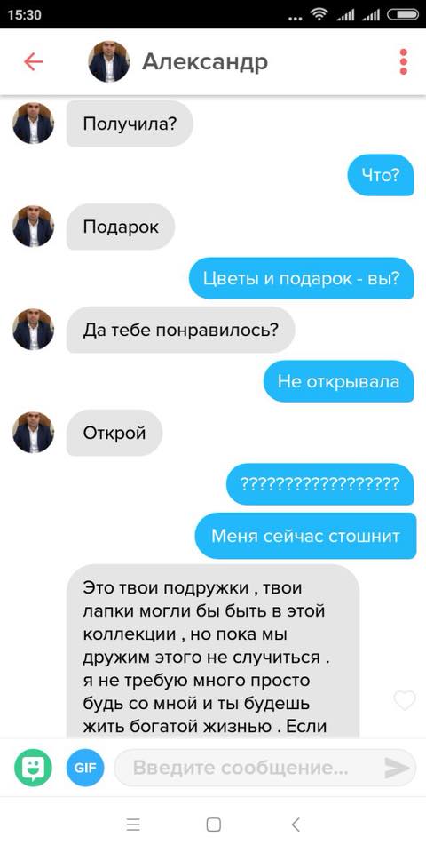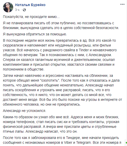 "В последние недели моя жизнь превратилась в ад. Всё это какой-то сюрреализм и напоминает или неудачный розыгрыш, или фильм ужасов. Всё началось с рандомного свайпа в Tinder и ненавязчивого общения по вечерам. Так я познакомилась с ним, с Александром. Сперва он казался галантным мужчиной и джентльменом, осыпал комплиментами и присылал открытки, хвастался своими связями и положением в обществе", - написала Наталья.
