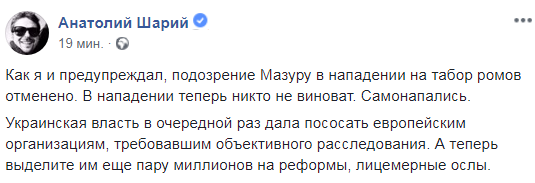 "Как я и предупреждал, подозрение Мазуру в нападении на табор ромов отменено. В нападении теперь никто не виноват. Самонапались. Украинская власть в очередной раз дала пососать европейским организациям, требовавшим объективного расследования", - указано в опубликованном сообщении на странице Шарий в Фейсбуке.