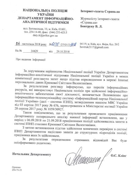 В ответе также отмечается, что сотрудники полиции делали запросы о Светлане Крюковой в информационно-телекоммуниационной системе "Информационный портал Нацполиции" в период с 6 по 21 сентября текущего года.