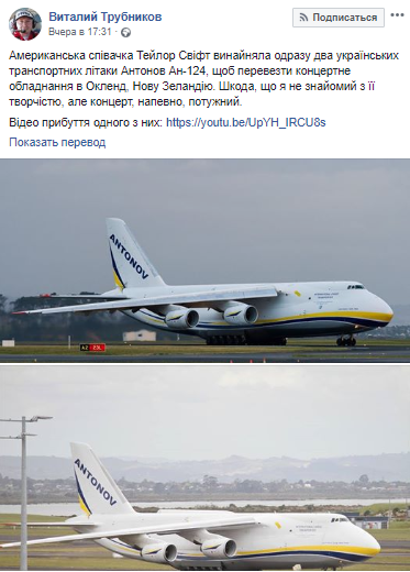 Американская певица Тейлор Свифт арендовала сразу два украинских транспортных самолета Ан-124, чтобы перевезти концертное оборудование в Окленд, Новая Зеландия. Об этом сообщил авиационный энтузиаст Виталий Трубников в Facebook.