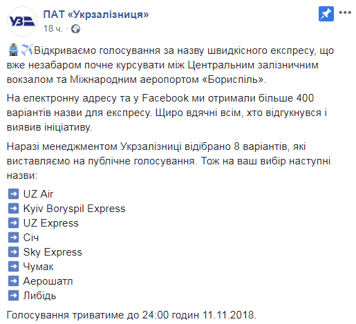 "На электронный адрес и в Facebook мы получили более 400 вариантов названия для экспресса. Благодарим всех, кто откликнулся и проявил инициативу.