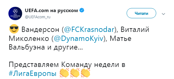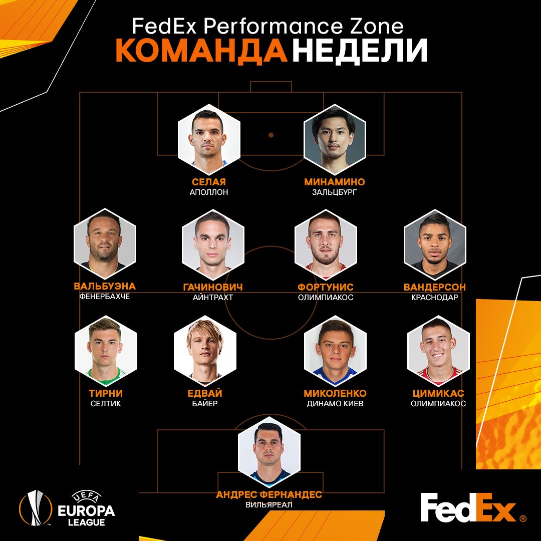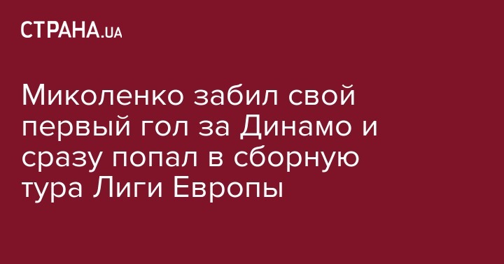 Левый защитник киевского Динамо Виталий Миколенко вошел в символическую сборную лучших футболистов тура в Лиге Европы по версии УЕФА. Также он оказался в "команде недели" авторитетного сайта WhoScored.