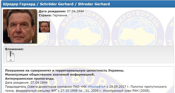 Экс-канцлер Германии Герхард Шредер попал в базу данных сайта Миротворец. Информация о нем размещена в разделе Чистилище в четверг, 8 ноября.