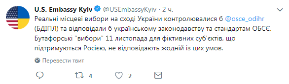 Так называемые "выборы в ЛДНР", проведение которых в ОРДЛО запланировано на 11 ноября, не соответствуют тем параметрам, которые позволили бы считать их реальными. Об этом сказано в заявлении Посольства США в Украине, опубликованном на его странице в Twitter.
