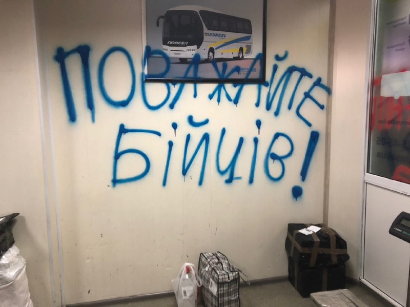 Радикалы из С14 исписали киевский автовокзал из-за отказа перевозить участников боевых действий