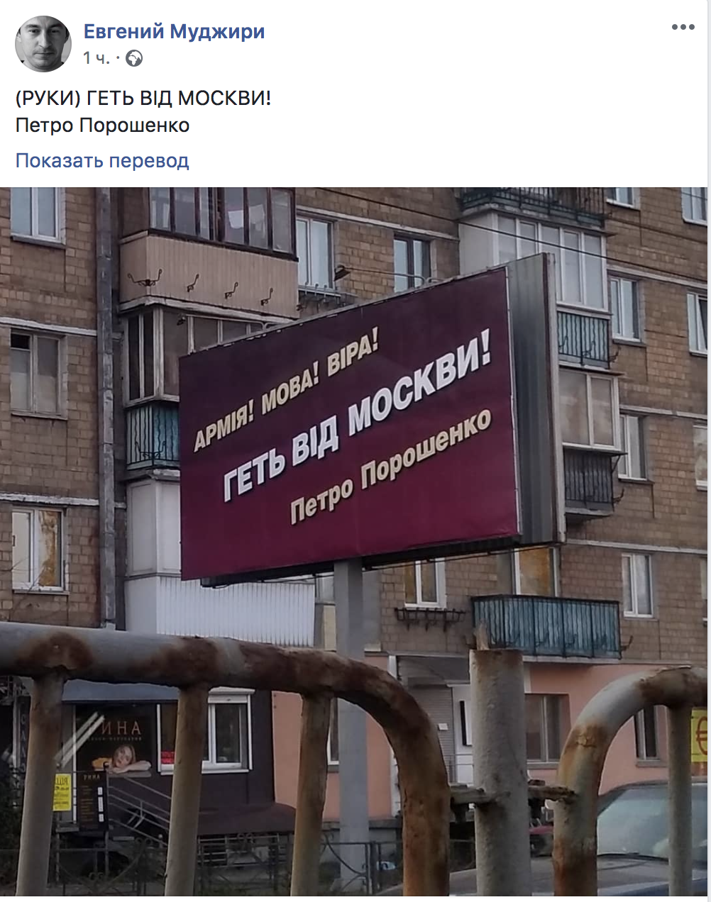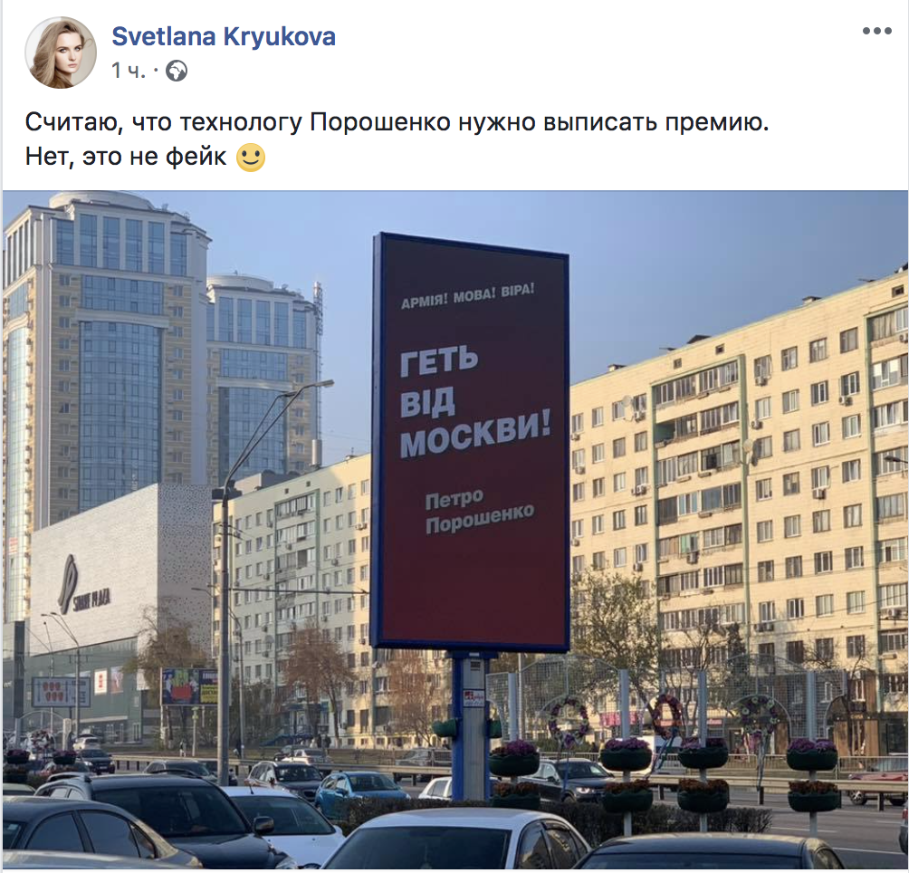"На рекламных щитах размещен слоган "Геть від Москви". "Руки прочь от Москвы", - как бы говорят нам новые социальные борды Петра Порошенко", - пишет блогер Гороховский.
