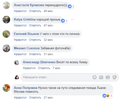 В комментариях к посту пользователи Facebook отмечают, что такие рекламные щиты появились по всему Киеву. Некоторые отмечают, что такую рекламу стоит разместить на пути следования поезда "Львов - Москва", другие пишут, что PR-служба президента перемудрила, также комментаторы предполагают, что у Порошенко, очевидно, с этим связано что-то личное.