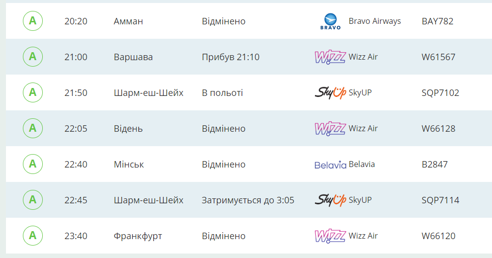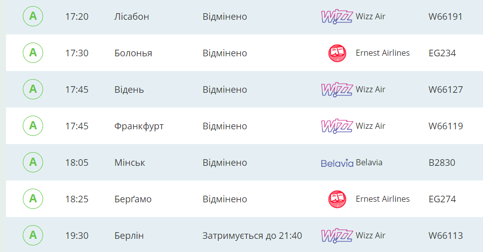Так, компания Wizz Air отменила вылеты в Вену, Лиссабон, Франкфурт и Гданьск. А перевозчик Ernest Airlines отменил перелеты из Киева в Болонью и Бергамо. Также Belavia отменила свой рейс в Минск.