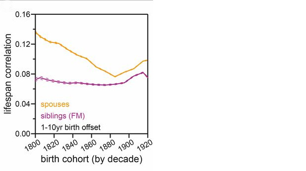Затем авторы работы изучили корреляцию продолжительности жизни у супругов и выяснили, что она была выше, чем у братьев и сестер разного пола.