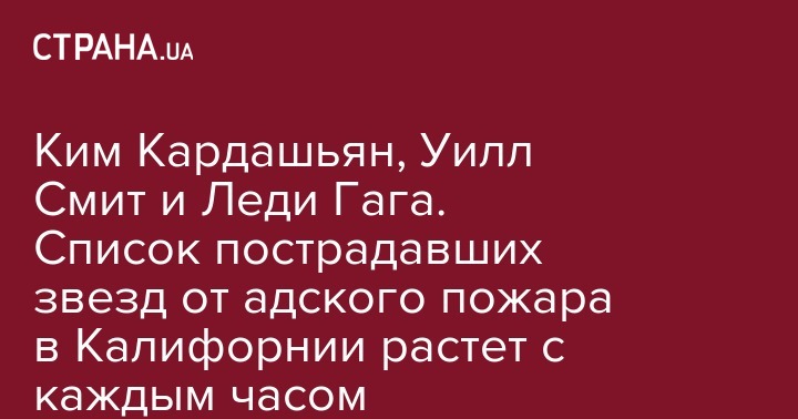 В Калифорнии продолжают полыхать лесные пожары, получившие название "Вулзи". Они достигли Малибу, Калабасаса и Агура-Хиллз, где находятся дома многих знаменитостей. Несколько сотен тысяч человек были вынуждены покинуть свои дома. К актеру Джерарду Батлеру и гитаристу Нилу Янгу, у которых уже сгорели дома, добавились актер Уилл Смит, певица  Леди Гага, телеведущая Ким Кардашьян и другие звезды.