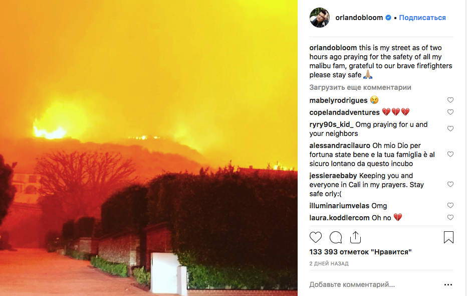 Актер Орландо Блум опубликовал фотографию своей улицы, которая находилась очень близко к пламени. Пострадал ли дом актера - пока не известно.