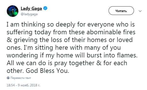 Певица Леди Гага уже эвакуировалась из своего особняка в Малибу. В Twitter она попросила всех молиться за всех пострадавших от пожаров. Также певица поделилась фотографией надвигающегося на ее дом огня и дыма.