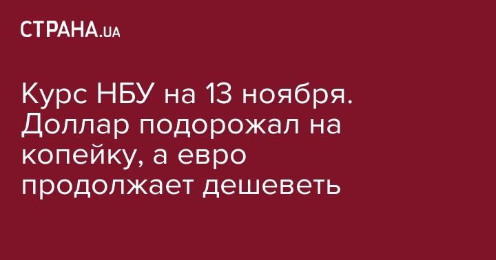 Во вторник, 13 ноября, Национальный банк Украины установил официальный курс основных валют, согласно которому доллар подорожал на 1,2 копейки по сравнению с предыдущим банковским днем. Об этом свидетельствует информация, размещенная на сайте регулятора.