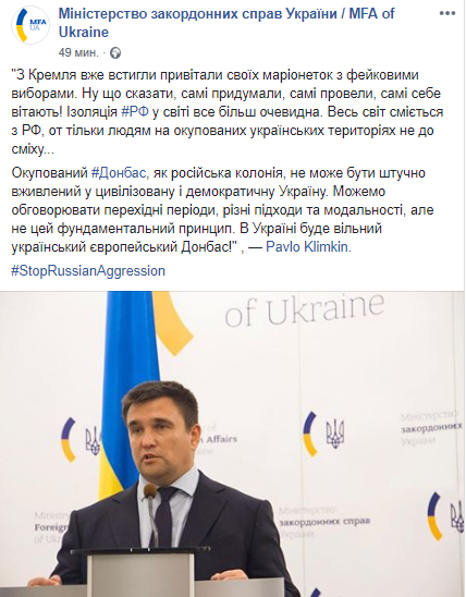 "Из Кремля уже успели поздравить своих марионеток с фейковыми выборами. Ну что сказать, сами придумали, сами провели, сами себя поздравляют!", - сказал Павел Климкин.