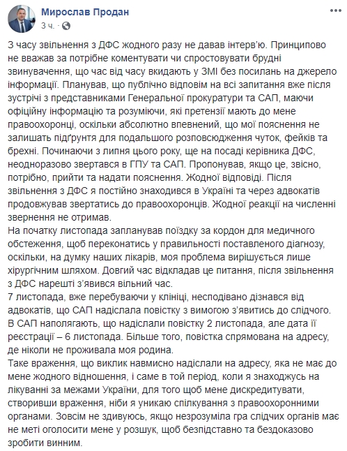 "В начале ноября запланировал поездку за границу для медицинского обследования, чтобы убедиться в правильности поставленного диагноза, поскольку, по мнению наших врачей, моя проблема решается только хирургическим путем. Долгое время откладывал этот вопрос, после увольнения из ГФС наконец появилось свободное время. 7 ноября, уже находясь в клинике, неожиданно узнал от адвокатов, что САП прислала повестку с требованием явиться к следователю. В САП настаивают, что прислали повестку на 2 ноября, но дата ее регистрации – 6 ноября. Более того, повестка направлена по адресу, где никогда не проживала моя семья", - рассказал экс-глава ГФС.