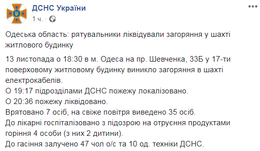 "13 ноября в 18:30 в г.Одесса на просп.Шевченко, 33-Б в 17-этажном жилом доме возникло возгорание в шахте электрокабелей. В 19:17 подразделениями ГСЧС пожар локализован. В 20:36 пожар ликвидирован. Спасено 7 человек, на свежий воздух выведено 35 человек", - говорится в сообщении.