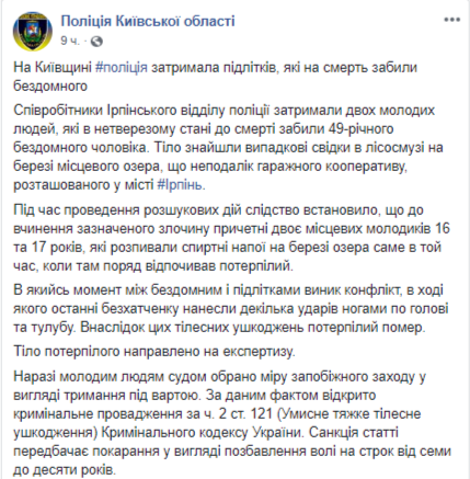 "В какой-то момент между бездомным и подростками возник конфликт, в ходе которого последние бездомному нанесли несколько ударов ногами по голове и туловищу. В результате этих телесных повреждений потерпевший скончался. Тело потерпевшего направлено на экспертизу", - рассказали в полиции. На данный момент суд избрал меру пресечения в виде содержания под стражей. По данному факту открыто уголовное производство по ч. 2 ст. 121 (Умышленное тяжкое телесное повреждение) Уголовного кодекса Украины. Санкция статьи предусматривает наказание в виде лишения свободы на срок от семи до десяти лет.
