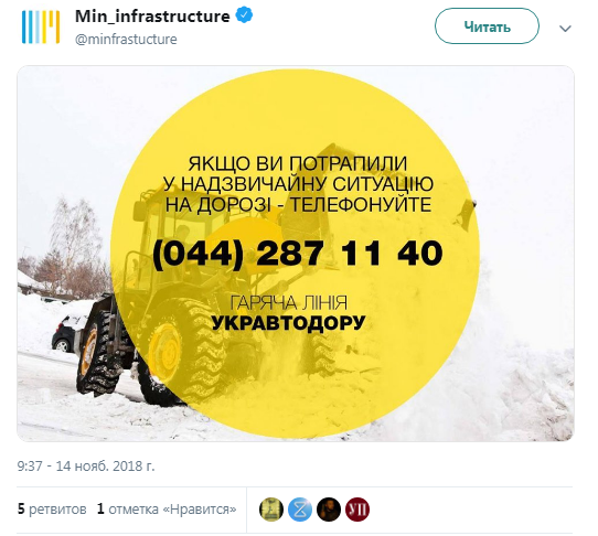 Так, например, утром 14 ноября в аккаунте Министерства инфраструктуры в Twitter появилось предупреждение для водителей с номером телефона "горячей линии", на которую стоит обращаться в случае ЧП на дороге. При этом на изображении присутствует трактор, который разгребает снежные заносы.