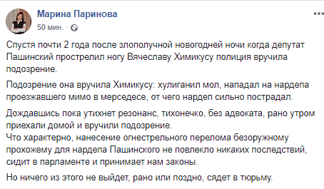 "Спустя почти 2 года после злополучной новогодней ночи когда депутат Пашинский прострелил ногу Вячеславу Химикусу полиция вручила подозрение. Подозрение она вручила Химикусу: хулиганил мол, нападал на нардепа проезжавшего мимо в Мерседесе, от чего нардеп сильно пострадал", - пишет юрист.