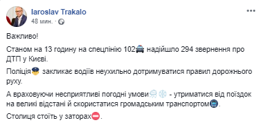 "По состоянию на 13 часов на спецлинию 102 поступило 294 обращения о ДТП в Киеве", - указал спикер.