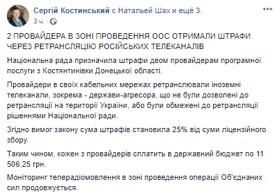 "Провайдеры в своих кабельных сетях ретранслировали иностранные телеканалы, в частности - государства-агрессора, которые не были разрешены к ретрансляции на территории Украины, или были ограничены к ретрансляции решениями Национального совета", - объяснил член Нацсовета Сергей Костинский в Facebook.