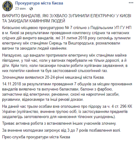 Киевская прокуратура совместно с полицией разоблачила вандалов, которые 31 июля 2018 силой остановили электричку между станциями Сырец и Вышгородская, разрисовали вагоны и забросали людей камнями.