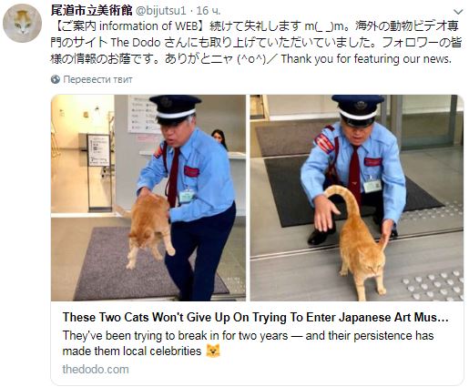 В конце концов музей сделал этих котов своими талисманами и дал им имена - Кен Чан (черный кот) и Гоу Чан (рыжий кот). Их неудачные попытки побывать в здании публикуют на официальной странице музея в Twitter.