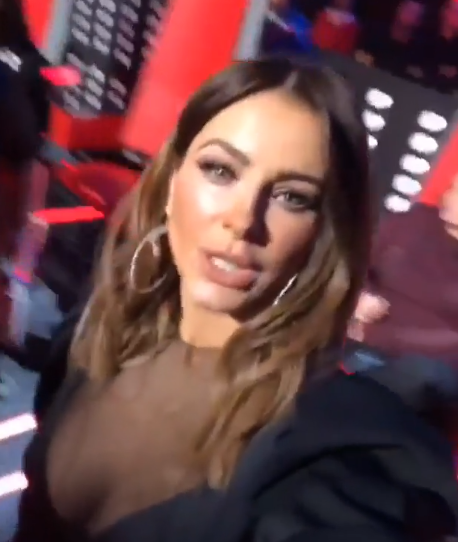 Ярко накрашенная певица позирует в темном платье с глубоким полупрозрачным декольте. Записи певица опубликовала в Instagram-stories.