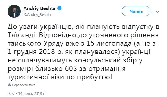 "Вниманию украинцев, которые планируют отпуск в Таиланде. Согласно уточненному решению тайского правительства уже с 15 ноября (а не с 1 декабря 2018 как планировалось) украинцы не будут платить консульский сбор в размере около $60 за получение туристической визы по прибытию", - написал Бешта.