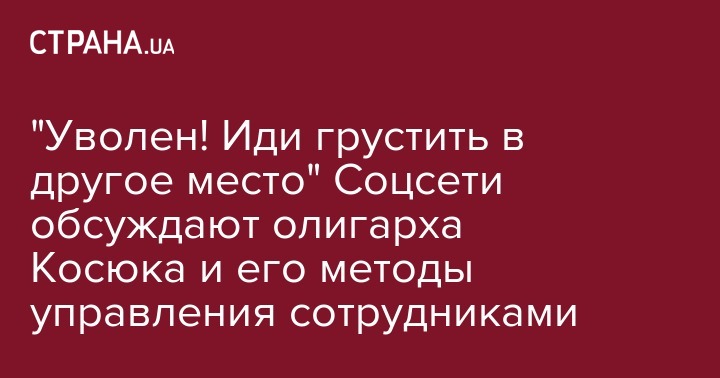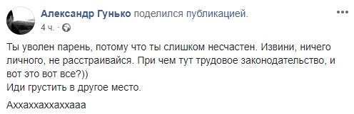 Пользователь Александр Гунько смеется над методами Костюка: "Ты уволен парень, потому что ты слишком несчастен. Извини, ничего личного, не расстраивайся. При чем тут трудовое законодательство, и вот это вот все?)) Иди грустить в другое место. Аххаххаххаххааа".