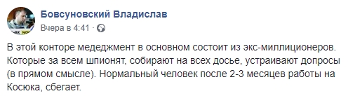 Журналист Владислав Бовсуновский пишет: "В этой конторе медеджмент в основном состоит из экс-миллиционеров. Которые за всем шпионят, собирают на всех досье, устраивают допросы (в прямом смысле). Нормальный человек после 2-3 месяцев работы на Косюка, сбегает".