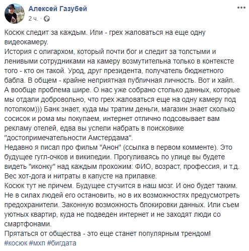 Журналист Алексей Газубей пишет о том, что тотальная слежка – это еще один шаг в будущее: "Косюк следит за каждым. Или - грех жаловаться на еще одну видеокамеру. История с олигархом, который почти бог и следит за толстыми и ленивыми сотрудниками на камеру возмутительна только в контексте того - кто он такой. Урод, друг президента, получатель бюджетного бабла. В общем - крайне неприятная публичная личность. Вот и хайп.